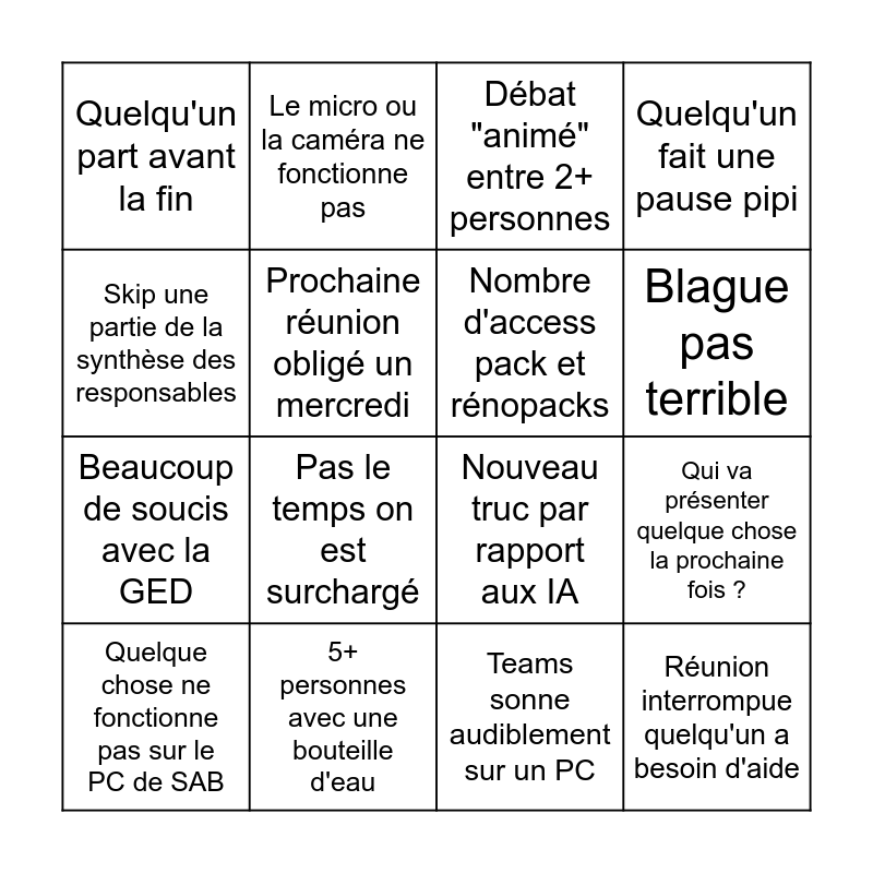 This bingo card has 16 words: Quelque chose ne fonctionne pas sur le PC de SAB, 5+ personnes avec une bouteille d'eau, Débat "animé" entre 2+ personnes, Quelqu'un fait une pause pipi, Skip une partie de la synthèse des responsables, Le micro ou la caméra ne fonctionne pas, Nouveau truc par rapport aux IA, Qui va présenter quelque chose la prochaine fois ?, Quelqu'un part avant la fin, Prochaine réunion obligé un mercredi, Teams sonne audiblement sur un PC, Blague pas terrible, Beaucoup de soucis avec la GED, Pas le temps on est surchargé, Nombre d'access pack et rénopacks and Réunion interrompue quelqu'un a besoin d'aide.