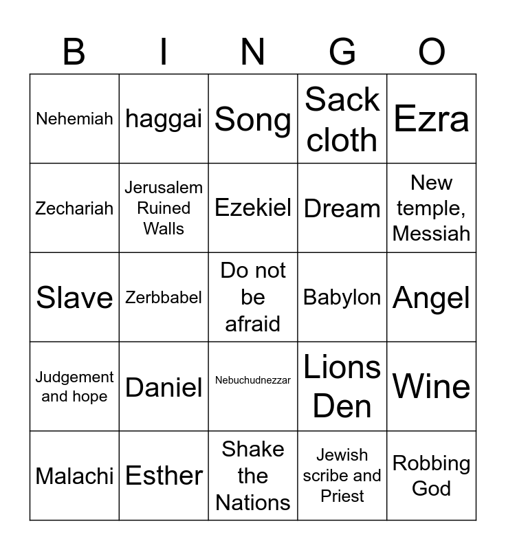 This bingo card has a free space and 24 words: Daniel, Esther, Ezekiel, Malachi, Ezra, Nehemiah, Zechariah, haggai, Babylon, Nebuchudnezzar, Dream, Slave, Lions Den, Wine, Jerusalem Ruined Walls, Jewish scribe and Priest, Angel, Song, New temple, Messiah, Zerbbabel, Robbing God, Judgement and hope, Sack cloth and Shake the Nations.