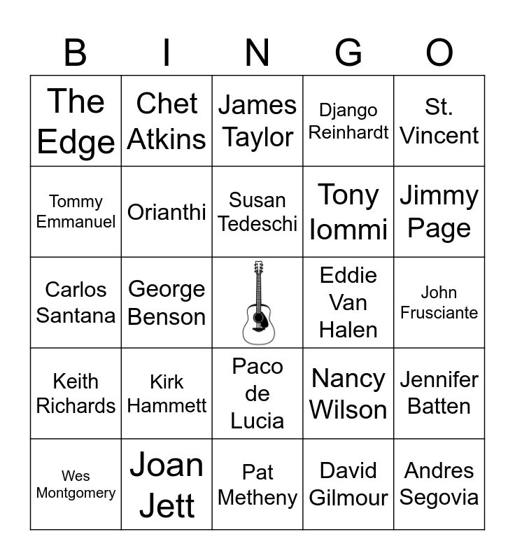 This bingo card has a free space and 35 words: Sharon Isbin, Lita Ford, John Williams, Orianthi, Paco de Lucia, Django Reinhardt, Tommy Emmanuel, Stevie Ray Vaughan, Susan Tedeschi, Jimi Hendrix, Carlos Santana, St. Vincent, Doc Watson, Eric Clapton, The Edge, Eddie Van Halen, David Gilmour, George Benson, Keith Richards, Andres Segovia, Nancy Wilson, Wes Montgomery, Jennifer Batten, Joan Jett, James Taylor, Jimmy Page, Brad Paisley, Bonnie Raitt, Tony Iommi, John Frusciante, Kaki King, Pat Metheny, Kirk Hammett, Chet Atkins and Sister Rosetta Tharpe.