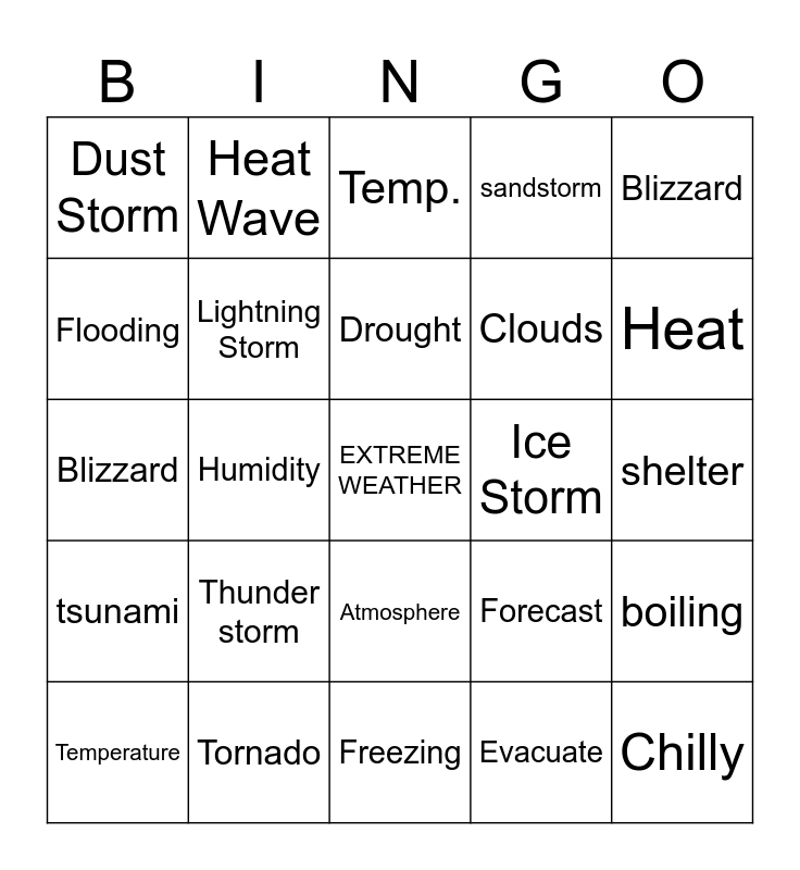 This bingo card has a free space and 24 words: Thunder storm, Tornado, Drought, Temperature, Blizzard, Dust Storm, Flooding, Heat Wave, Ice Storm, Atmosphere, Clouds, Blizzard, Forecast, boiling, Lightning Storm, Evacuate, shelter, Temp., Heat, Humidity, Chilly, tsunami, sandstorm and Freezing.