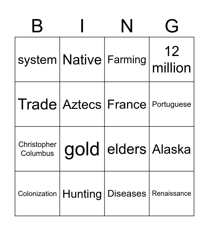 This bingo card has 16 words: Hunting, Alaska, Farming, system, Christopher Columbus, Native, elders, Diseases, Trade, Aztecs, Colonization, 12 million, gold, Portuguese, France and Renaissance.