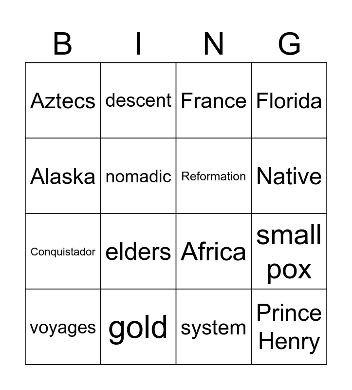 This bingo card has 16 words: gold, small pox, France, Aztecs, Conquistador, descent, Africa, system, Alaska, nomadic, voyages, Florida, elders, Native, Reformation and Prince Henry.