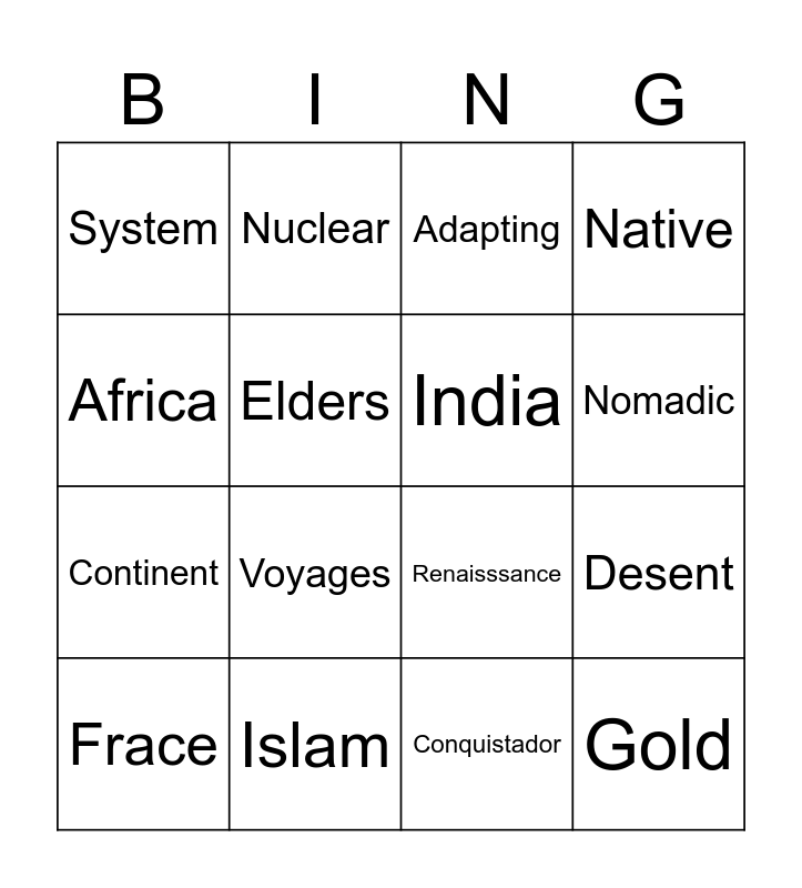 This bingo card has 16 words: Islam, Desent, Adapting, System, Continent, Nuclear, Renaisssance, Conquistador, Africa, Elders, Frace, Native, Voyages, Nomadic, India and Gold.