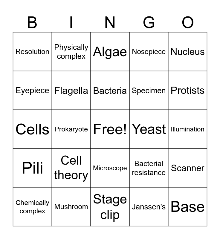This bingo card has a free space and 33 words: Multicellular, Unicellular, Prokaryote, Eukaryote, Pili, Flagella, Nucleus, Chemically complex, Physically complex, Microscopic, Bacteria, Algae, Plant, Animal, Yeast, Protists, Mushroom, Cells, Cell theory, Bacterial resistance, Microscope, Magnification, Resolution, Illumination, Stage clip, Base, Nosepiece, Specimen, Eyepiece, Scanner, Hooke, Janssen's and Reading stone.