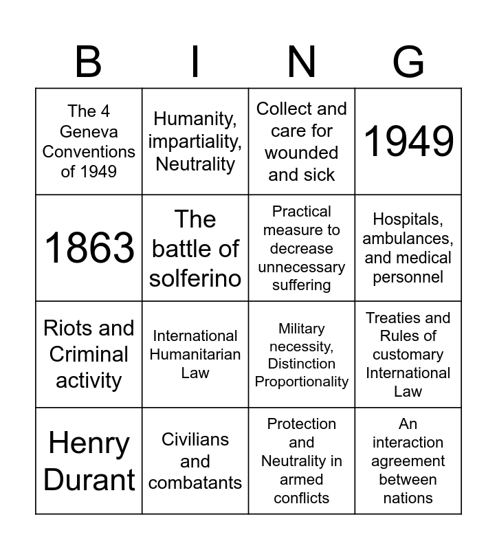 This bingo card has 16 words: Civilians and combatants, Treaties and Rules of customary International Law, Collect and care for wounded and sick, The 4 Geneva Conventions of 1949, Riots and Criminal activity, Humanity, impartiality, Neutrality, Military necessity, Distinction Proportionality, Protection and Neutrality in armed conflicts, 1863, The battle of solferino, Henry Durant, 1949, International Humanitarian Law, Hospitals, ambulances, and medical personnel, Practical measure to decrease unnecessary suffering and An interaction agreement between nations.