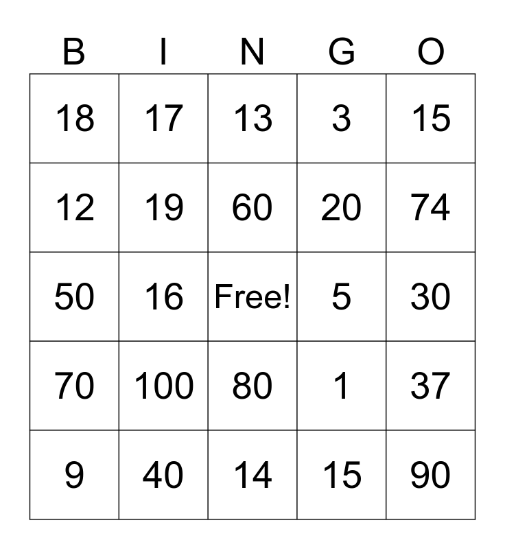 This bingo card has a free space and 24 words: 100, 40, 60, 9, 15, 18, 12, 17, 5, 80, 20, 50, 1, 37, 19, 15, 30, 13, 74, 16, 90, 70, 3 and 14.