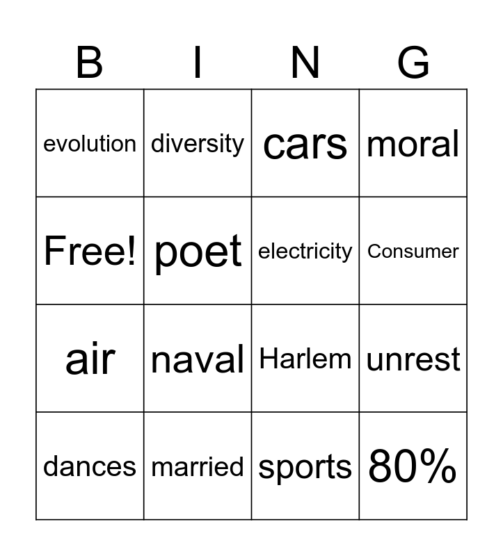 This bingo card has 16 words: married, unrest, cars, evolution, air, diversity, Harlem, sports, Free!, poet, dances, moral, naval, Consumer, electricity and 80%.