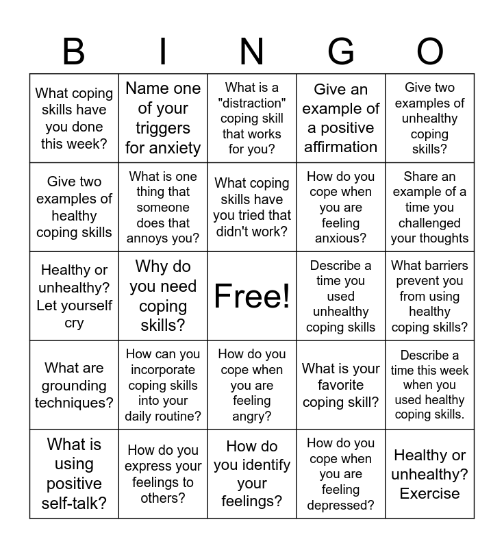 This bingo card has a free space and 24 words: How can you incorporate coping skills into your daily routine?, How do you express your feelings to others?, What coping skills have you tried that didn't work?, What is using positive self-talk?, Give two examples of unhealthy coping skills?, What coping skills have you done this week?, Give two examples of healthy coping skills, Name one of your triggers for anxiety, Describe a time you used unhealthy coping skills, How do you cope when you are feeling angry?, How do you cope when you are feeling anxious?, Healthy or unhealthy? Let yourself cry, What is your favorite coping skill?, Describe a time this week when you used healthy coping skills., What is one thing that someone does that annoys you?, How do you cope when you are feeling depressed?, What barriers prevent you from using healthy coping skills?, What is a "distraction" coping skill that works for you?, Share an example of a time you challenged your thoughts, Why do you need coping skills?, Healthy or unhealthy? Exercise, What are grounding techniques?, Give an example of a positive affirmation and How do you identify your feelings?.