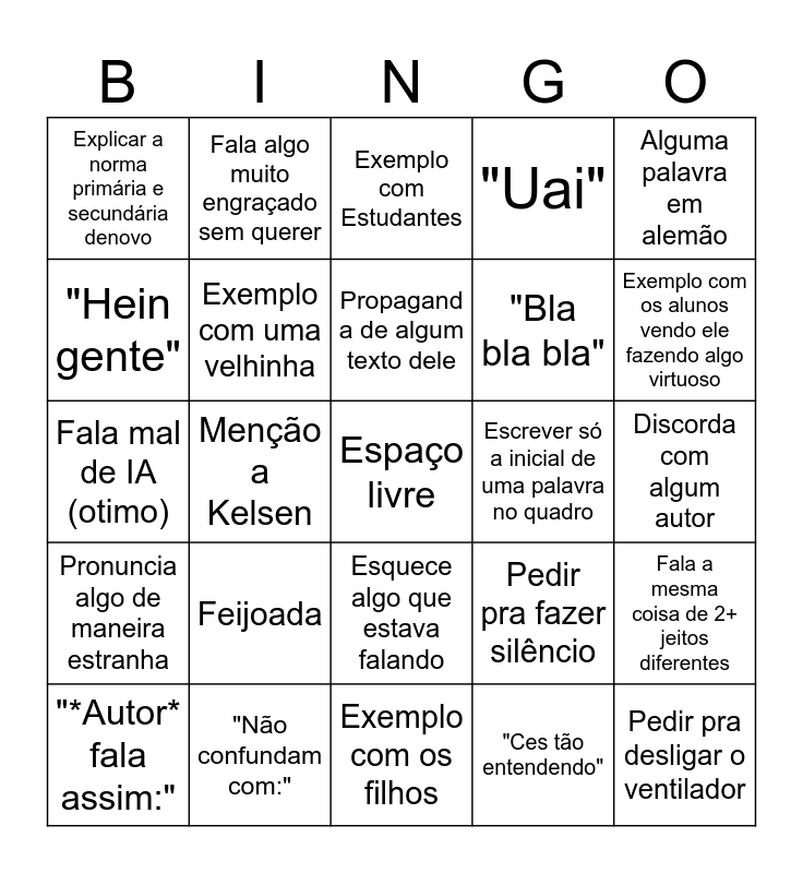 This bingo card has a free space and 35 words: Menção a Kant, Menção a Alexy, Exemplo com Trânsito, Exemplo com uma velhinha, Esquece algo que estava falando, "Uai", "Hein gente", Falar da diferença de alguma tradução, Propagand a de algum texto dele, Exemplo com fumante, Fala mal de IA (otimo), Alguma palavra em alemão, Colocar o computador para carregar, "Na minha opinião", Explicar a norma primária e secundária denovo, Escrever só a inicial de uma palavra no quadro, "Ces tão entendendo", Menção a Kelsen, Pronuncia algo de maneira estranha, Pedir pra desligar o ventilador, Pedir pra fazer silêncio, "*Autor* fala assim:", Fala a mesma coisa de 2+ jeitos diferentes, "Não confundam com:", Exemplo com Estudantes, Exemplo com os alunos vendo ele fazendo algo virtuoso, "Paga uma multa de 100R$", LAT, "Bla bla bla", Discorda com algum autor, Lê um bloco de texto no computador, Exemplo com os filhos, Feijoada, Fala algo muito engraçado sem querer and "Eu concordo com ele/ela".