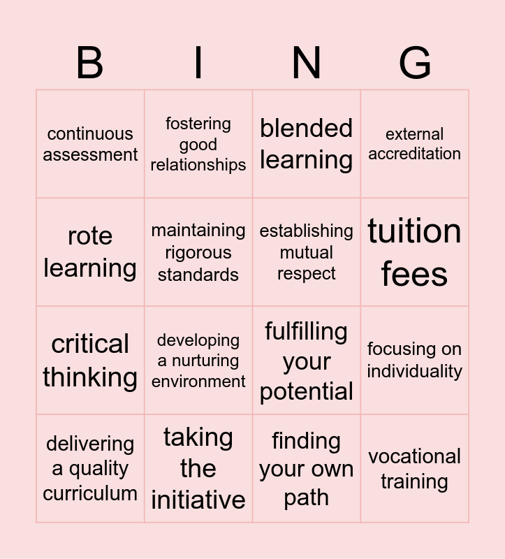 This bingo card has 16 words: taking the initiative, focusing on individuality, blended learning, continuous assessment, critical thinking, fostering good relationships, fulfilling your potential, finding your own path, rote learning, maintaining rigorous standards, delivering a quality curriculum, external accreditation, developing a nurturing environment, tuition fees, establishing mutual respect and vocational training.