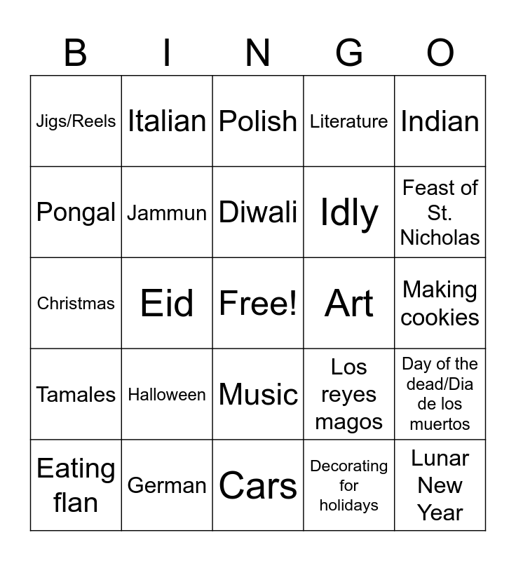 This bingo card has a free space and 44 words: Dancing, Lunar New Year, Sharing food, Eating flan, Parties, Decorating for holidays, Polish, Irish, Indian, German, Literature, Art, Music, Halloween, Cows, Cars, Bread, Christmas, Honey Baked Ham, Feast of St. Nicholas, Italian, Bonjour Les Amis, Gaeilge, Jigs/Reels, Hiding the pickle, Making cookies, Egg hunt, Easter, Los reyes magos, Tamales, Kids day, Day of the dead/Dia de los muertos, Quinceanera, Ramadan, Eid, Arroz con leche, Indian food, Bharatanatyam (traditional Indian dance), Diwali, Pongal, Idly, chutney, Jammun and Eid.