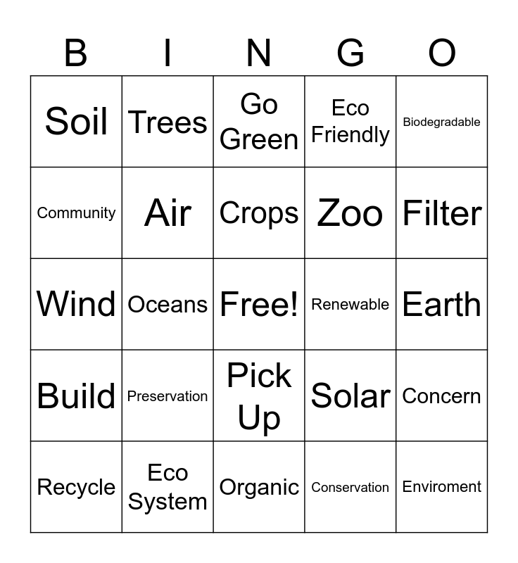 This bingo card has a free space and 44 words: Service, Enviroment, Clean, Recycle, Composting, Conservation, Go Green, Reuse, Biodegradable, Eco System, Eco Friendly, Renewable, Pick Up, Preservation, Restoration, Organic, Energy, Wind, Water, Filter, Trees, Wildlife, Air, Soil, Planting, Earth, Habitat, Reduce, Solar, Build, Create, Concern, Parks, Rivers, Oceans, Lakes, Mountains, Fields, Crops, Community, Zoo, Aquarium, Air and Fire.