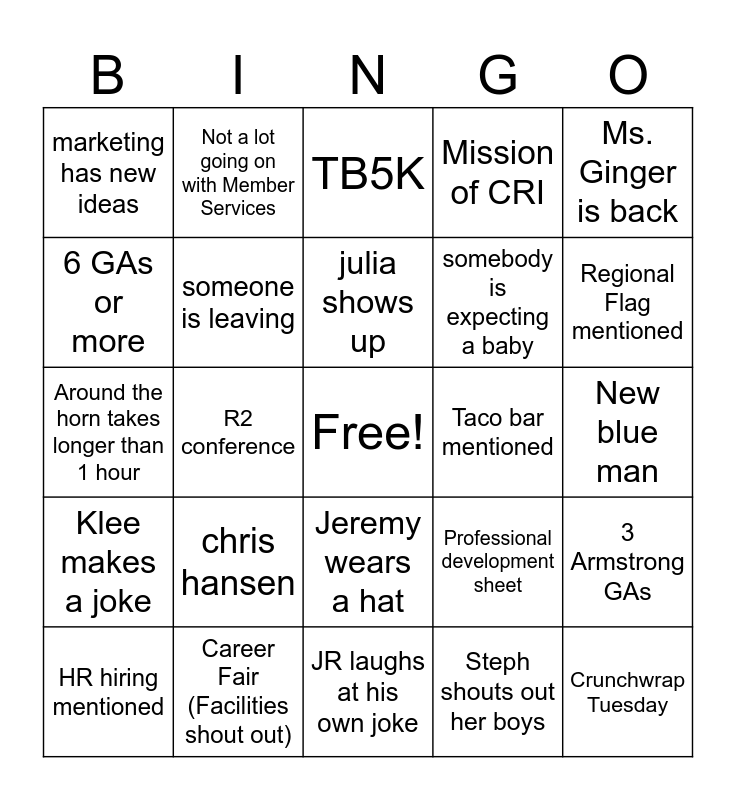 This bingo card has a free space and 24 words: chris hansen, Career Fair (Facilities shout out), julia shows up, HR hiring mentioned, Ms. Ginger is back, marketing has new ideas, 6 GAs or more, Not a lot going on with Member Services, Taco bar mentioned, Jeremy wears a hat, somebody is expecting a baby, Around the horn takes longer than 1 hour, Professional development sheet, 3 Armstrong GAs, someone is leaving, Steph shouts out her boys, New blue man, TB5K, Regional Flag mentioned, R2 conference, Crunchwrap Tuesday, Klee makes a joke, Mission of CRI and JR laughs at his own joke.