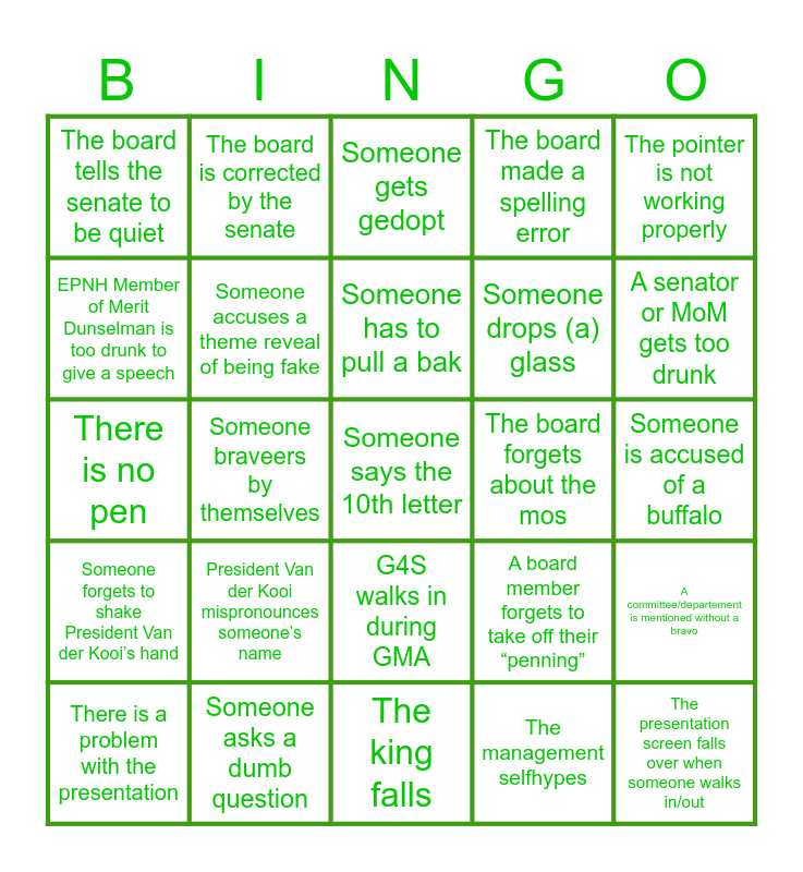 This bingo card has 29 words: There is a problem with the presentation, A department is misnamed as a committee, Someone braveers by themselves, The presentation screen falls over when someone walks in/out, The board tells the senate to be quiet, Someone gets gedopt, Someone accuses a theme reveal of being fake, President Van der Kooi mispronounces someone’s name, The board forgets about the mos, Someone asks a dumb question, Someone is accused of a buffalo, Someone says the 10th letter, The king falls, The management selfhypes, A senator or MoM gets too drunk, Someone is hit in the head with a chocolate coin, G4S walks in during GMA, Someone forgets to shake President Van der Kooi’s hand, The pointer is not working properly, There is no pen, A board member forgets to take off their “penning”, Someone calls a false bingo, Someone drops (a) glass, EPNH Member of Merit Dunselman is too drunk to give a speech, The board made a spelling error, The board is corrected by the senate, A committee/departement is mentioned without a bravo, Someone has to pull a bak and MoM Kok tells a joke.