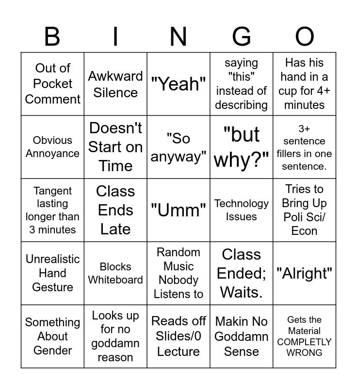 This bingo card has a free space and 24 words: Blocks Whiteboard, Looks up for no goddamn reason, "So anyway", Something About Gender, Has his hand in a cup for 4+ minutes, Out of Pocket Comment, Obvious Annoyance, Awkward Silence, Technology Issues, Random Music Nobody Listens to, "but why?", Tangent lasting longer than 3 minutes, Class Ended; Waits., "Alright", Doesn't Start on Time, Makin No Goddamn Sense, Tries to Bring Up Poli Sci/ Econ, "Yeah", 3+ sentence fillers in one sentence., Class Ends Late, Gets the Material COMPLETLY WRONG, Unrealistic Hand Gesture, saying "this" instead of describing and Reads off Slides/0 Lecture.