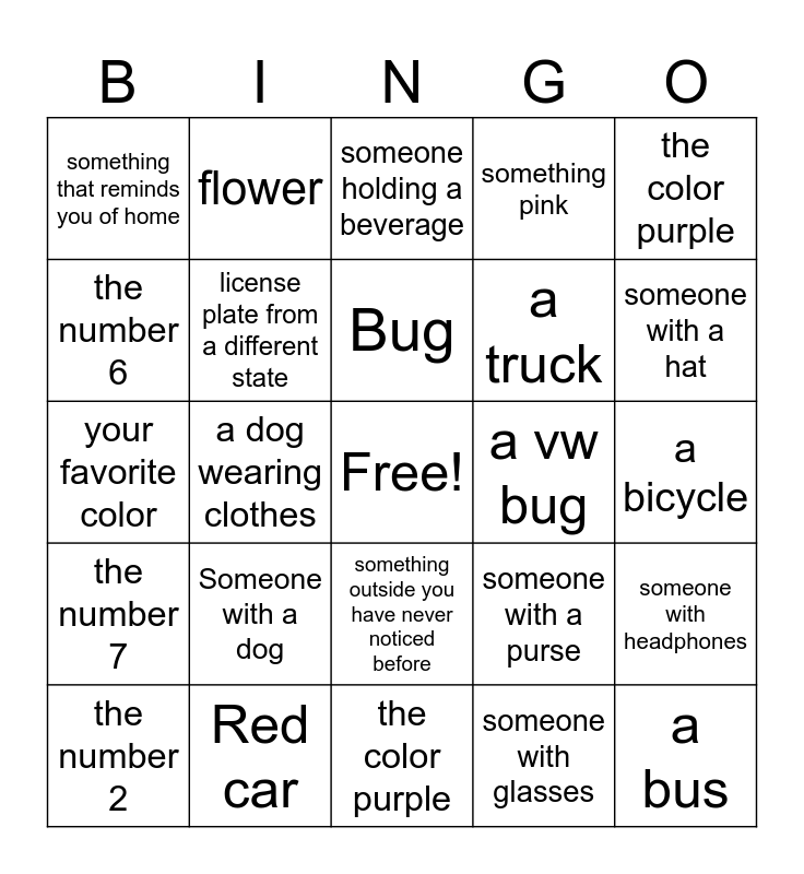 This bingo card has a free space and 24 words: Someone with a dog, Red car, Bug, the number 2, the color purple, something that reminds you of home, the number 6, flower, a vw bug, something outside you have never noticed before, a truck, your favorite color, someone with a purse, someone with headphones, license plate from a different state, someone with glasses, a bicycle, someone holding a beverage, someone with a hat, a dog wearing clothes, a bus, the number 7, something pink and the color purple.
