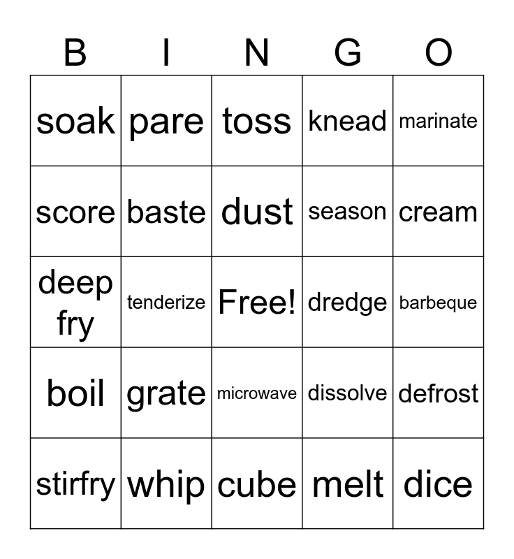 This bingo card has a free space and 52 words: chop, dice, mince, cube, grate, shred, pare, peel, score, slice, baste, freeze, defrost, dissolve, drain, strain, dust, dredge, grease, marinate, tenderize, melt, soak, season, vent, beat, blend, combine, cream, cut in, fold in, knead, mix, sift, stir, toss, whip, bake, broil, grill, roast, barbeque, boil, braise, microwave, steam, simmer, deep fry, fry, sauté, stirfry and preheat.