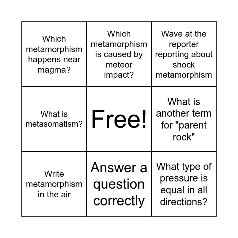 This bingo card has a free space and 19 words: Raise your hand four times, Say the word "metamorphism" out loud, Wave at the reporter reporting about shock metamorphism, What is the process of rocks changing due to heat?, Name two factor involved in metamorphism, What type of pressure is equal in all directions?, What is the process called when fluids change rock minerals?, Which metamorphism happens near magma?, Which metamorphism is caused by meteor impact?, What’s it called when heat makes crystals grow bigger?, At what depth does burial metamorphism often begin?, What is another term for "parent rock", Write metamorphism in the air, What is metamorphism?, When standing up to participate, spin once, Which type of pressure causes foliation?, What is metasomatism?, Answer a question correctly and Volunteer to read.