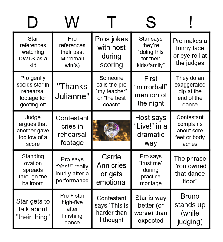 This bingo card has a free space and 49 words: Celebrity family member is caught on camera crying, Bruno stands up (while judging), A nervous celeb says “I just don’t want to embarrass myself”, Contestant says “This is harder than I thought, Pro says “Yes!!” really loudly after a performance, Contestant is told “You could go all the way”, Pro references their past Mirrorball win(s), Carrie Anne is the lift police, Pro gently scolds star in rehearsal footage for goofing off, Men's shirt is ripped open, "Thanks Julianne", Star says they’re “doing this for their kids/family”, The phrase “You owned that dance floor”, Pro says “trust me” during practice montage, Derek references technique, Contestant kisses pro on the cheek after the dance, Someone calls the pro “my teacher” or “the best coach”, Host says “Live!” in a dramatic way, Star gushes “This is a dream come true”, Pro makes a funny face or eye roll at the judges, Contestant cries in rehearsal footage, Star is way better (or worse) than expected, Star references watching DWTS as a kid, First “mirrorball” mention of the night, Bruno falls out of chair or dramatically gestures, They do an exaggerated dip at the end of the dance, Star gets to talk about "their thing", Video package uses dramatic music to show rehearsal struggles, Carrie Ann cries or gets emotional, Standing ovation spreads through the ballroom, Era's tour choreography, A TikTok dance move sneaks into choreography, Celebrity makes a self-deprecating joke about their age, Star compares dance training to sports/acting career, Pro + star high-five after finishing dance, Celeb clearly flirts with their pro, Pro dramatically mouths the counts (“5-6-7-8”) while dancing, Star and pro both laugh uncontrollably in rehearsal footage, Contestant complains about sore feet or body aches, “You need to work on your frame”, Their rehearsal clip ends with “Are we ready for this?”, Judge says “Best dance of the night so far”, A “4” shows up on premiere night (ouch), A star dedicates their dance to someone, Judge argues that another gave too low of a score, Pros jokes with host during scoring, Host makes a corny pun related to the dance style, Glitter cannon or confetti moment and Audience boos at a judge’s low score.