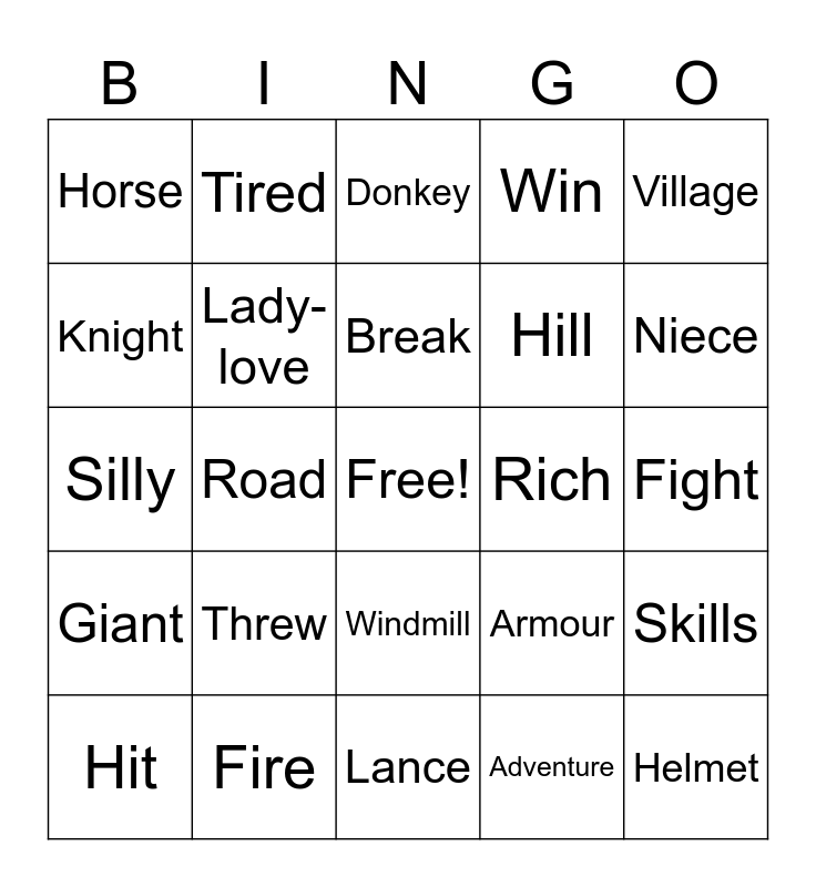 This bingo card has a free space and 29 words: Hit, Clever, Road, Squire, Horse, Donkey, Lady-love, Threw, Rich, Fire, Fight, Helmet, Lance, Adventure, Niece, Ribbon, Windmill, Giant, Village, Silly, Armour, Fields, Hill, Knight, Win, Tired, Skills, Break and Brave.