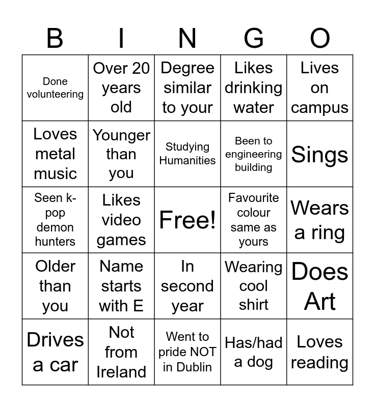 This bingo card has a free space and 24 words: Name starts with E, Not from Ireland, Studying Humanities, Drives a car, Lives on campus, Done volunteering, Loves metal music, Over 20 years old, Favourite colour same as yours, In second year, Been to engineering building, Seen k-pop demon hunters, Wearing cool shirt, Does Art, Younger than you, Has/had a dog, Wears a ring, Degree similar to your, Sings, Likes video games, Loves reading, Older than you, Likes drinking water and Went to pride NOT in Dublin.