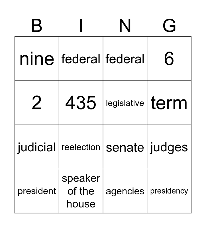 This bingo card has 16 words: speaker of the house, judges, federal, nine, judicial, federal, senate, agencies, 2, 435, president, 6, reelection, term, legislative and presidency.