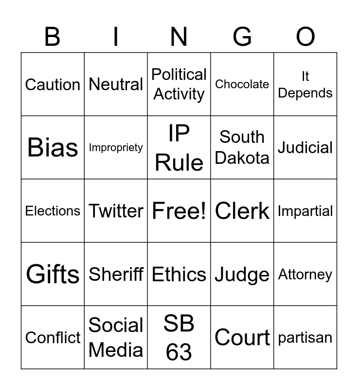This bingo card has a free space and 26 words: Ethics, Court, IP Rule, Social Media, It Depends, Caution, Bias, Neutral, Impartial, Judge, South Dakota, Elections, Attorney, Conflict, Twitter, Facebook, Chocolate, Gifts, Political Activity, partisan, Judicial, SB 63, Clerk, Sheriff, Impropriety and Appearance.