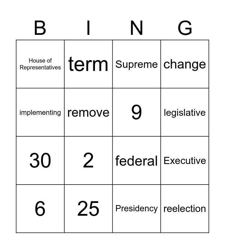 This bingo card has 16 words: 25, Executive, Supreme, House of Representatives, 30, term, federal, Presidency, implementing, remove, 6, change, 2, legislative, 9 and reelection.