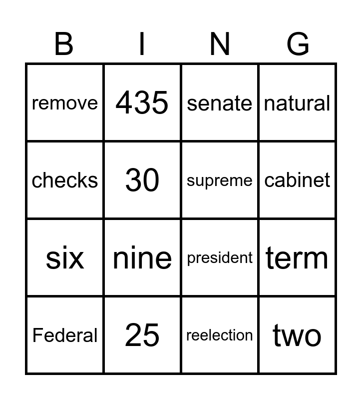 This bingo card has 16 words: Federal, 25, senate, natural, checks, 435, president, term, remove, 30, reelection, cabinet, six, nine, supreme and two.