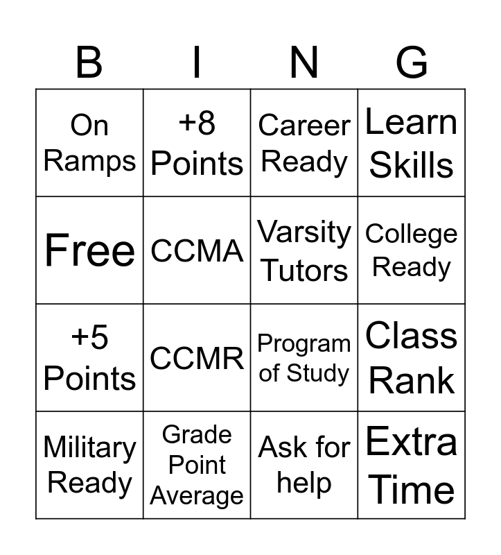 This bingo card has 16 words: Grade Point Average, Class Rank, Career Ready, On Ramps, +5 Points, +8 Points, Program of Study, Ask for help, Free, CCMA, Military Ready, Learn Skills, CCMR, College Ready, Varsity Tutors and Extra Time.
