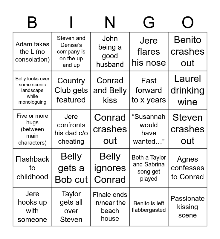 This bingo card has 25 words: Belly gets a Bob cut, Finale ends in/near the beach house, Conrad and Belly kiss, Jere hooks up with someone, Benito crashes out, Adam takes the L (no consolation), Belly looks over some scenic landscape while monologuing, Steven and Denise’s company is on the up and up, “Susannah would have wanted…”, Belly ignores Conrad, Fast forward to x years, Five or more hugs (between main characters), Both a Taylor and Sabrina song get played, Agnes confesses to Conrad, Country Club gets featured, Passionate kissing scene, Steven crashes out, John being a good husband, Laurel drinking wine, Jere confronts his dad c/o cheating, Conrad crashes out, Taylor gets all over Steven, Flashback to childhood, Jere flares his nose and Benito is left flabbergasted.