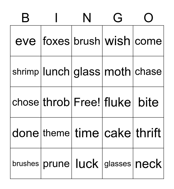 This bingo card has a free space and 34 words: have, glasses, give, love, done, lunch, come, brushes, foxes, dishes, glass, brush, fox, dish, fluke, chase, prune, chose, theme, cake, time, globe, eve, bite, luck, neck, wish, with, moth, shrimp, shrug, throb, thrift and spring.