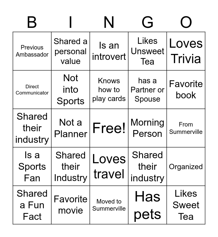 This bingo card has a free space and 34 words: Has kids, Has pets, Carolina Fan, Clemson Fan, Is a Sports Fan, Not into Sports, Loves Trivia, Shared a Fun Fact, Shared a personal value, Shared a Favorite saying, Knows how to play cards, Is an introvert, Is an extravert, Night owl, Morning Person, Favorite book, Favorite movie, Shared their industry, Shared their Industry, Shared their industry, Loves travel, Home body, Previous Ambassador, From Summerville, Moved to Summerville, Likes Sweet Tea, Likes Unsweet Tea, Coffee Drinker, has a Partner or Spouse, Direct Communicator, Is a Planner, Not a Planner, Organized and Multi-tasker.