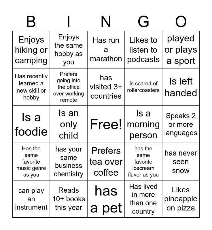 This bingo card has a free space and 25 words: has your same business chemistry, has a pet, has visited 3+ countries, can play an instrument, played or plays a sport, Enjoys hiking or camping, Has recently learned a new skill or hobby, Enjoys the same hobby as you, Is a morning person, Prefers tea over coffee, Is scared of rollercoasters, Is a foodie, has the same favorite icecream flavor as you, has never seen snow, Prefers going into the office over working remote, Has binged watch a show recently, Speaks 2 or more languages, Has run a marathon, Is left handed, Is an only child, Likes pineapple on pizza, Reads 10+ books this year, Has the same favorite music genre as you, Likes to listen to podcasts and Has lived in more than one country.