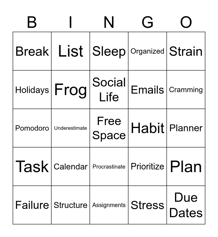 This bingo card has a free space and 34 words: Success, Stress, Networking, Relationships, Task, Frog, Strain, Failure, List, Worry, Social Life, Sleep, Accomplished, Reduce, Habit, Cramming, Structure, Pomodoro, Calendar, Prioritize, Procrastinate, Motivation, Break, Planner, Assignments, Due Dates, Organized, Work, Emails, Holidays, Grades, Underestimate, Plan and Appointments.