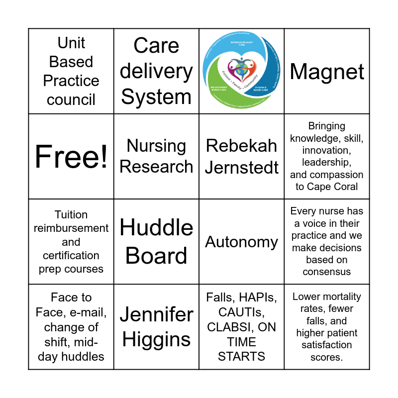 This bingo card has 1 images and 15 words: Jennifer Higgins, Every nurse has a voice in their practice and we make decisions based on consensus, Unit Based Practice council, Tuition reimbursement and certification prep courses, Care delivery System, Autonomy, Falls, HAPIs, CAUTIs, CLABSI, ON TIME STARTS, Free!, Nursing Research, Face to Face, e-mail, change of shift, mid-day huddles, Magnet, Huddle Board, Bringing knowledge, skill, innovation, leadership, and compassion to Cape Coral, Rebekah Jernstedt and Lower mortality rates, fewer falls, and higher patient satisfaction scores..