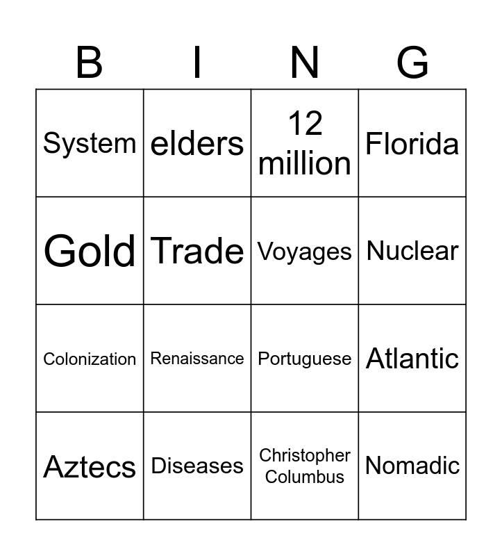 This bingo card has 16 words: Diseases, Atlantic, 12 million, System, Colonization, elders, Portuguese, Christopher Columbus, Gold, Trade, Aztecs, Florida, Renaissance, Nuclear, Voyages and Nomadic.