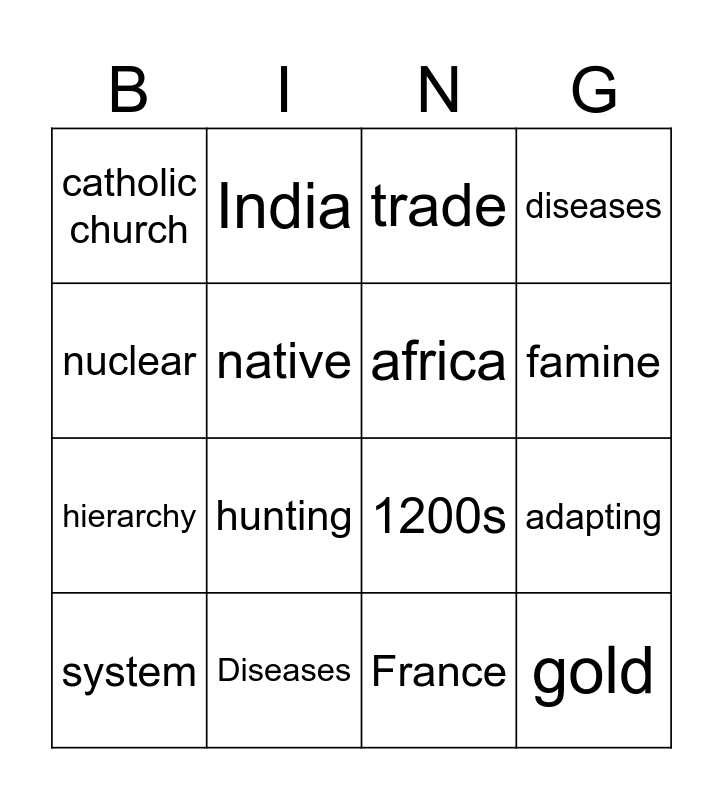This bingo card has 16 words: Diseases, adapting, trade, catholic church, hierarchy, India, 1200s, France, nuclear, native, system, diseases, hunting, famine, africa and gold.