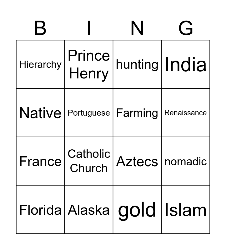 This bingo card has 16 words: Alaska, nomadic, hunting, Hierarchy, France, Prince Henry, Aztecs, gold, Native, Portuguese, Florida, India, Catholic Church, Renaissance, Farming and Islam.