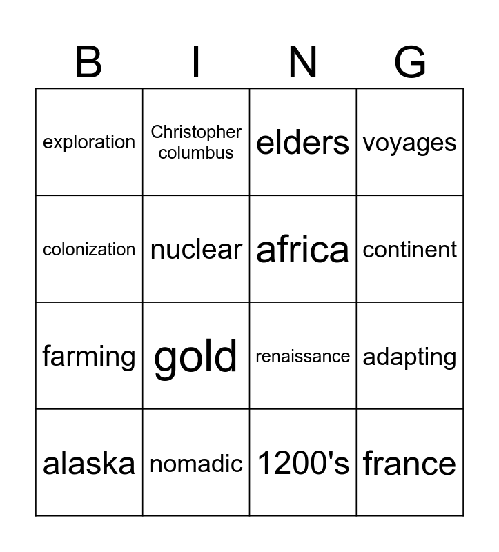 This bingo card has 16 words: nomadic, adapting, elders, exploration, farming, Christopher columbus, renaissance, 1200's, colonization, nuclear, alaska, voyages, gold, continent, africa and france.