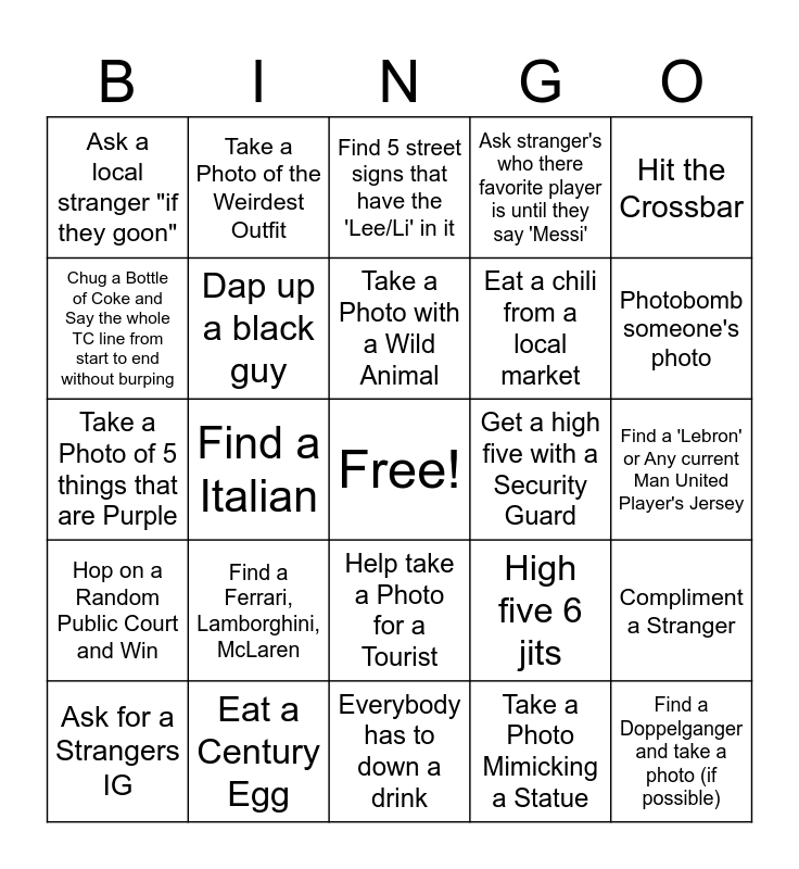 This bingo card has a free space and 24 words: Ask for a Strangers IG, Find a Ferrari, Lamborghini, McLaren, Take a Photo with a Wild Animal, Take a Photo Mimicking a Statue, Hit the Crossbar, Ask a local stranger "if they goon", Take a Photo of the Weirdest Outfit, Find 5 street signs that have the 'Lee/Li' in it, Get a high five with a Security Guard, Find a 'Lebron' or Any current Man United Player's Jersey, Take a Photo of 5 things that are Purple, Dap up a black guy, High five 6 jits, Compliment a Stranger, Chug a Bottle of Coke and Say the whole TC line from start to end without burping, Eat a Century Egg, Everybody has to down a drink, Ask stranger's who there favorite player is until they say 'Messi', Photobomb someone's photo, Hop on a Random Public Court and Win, Find a Italian, Help take a Photo for a Tourist, Eat a chili from a local market and Find a Doppelganger and take a photo (if possible).