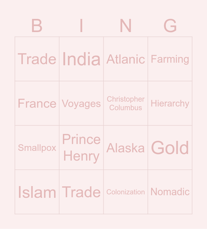 This bingo card has 16 words: Trade, Gold, Atlanic, Trade, Smallpox, India, Alaska, Colonization, France, Voyages, Islam, Farming, Prince Henry, Hierarchy, Christopher Columbus and Nomadic.