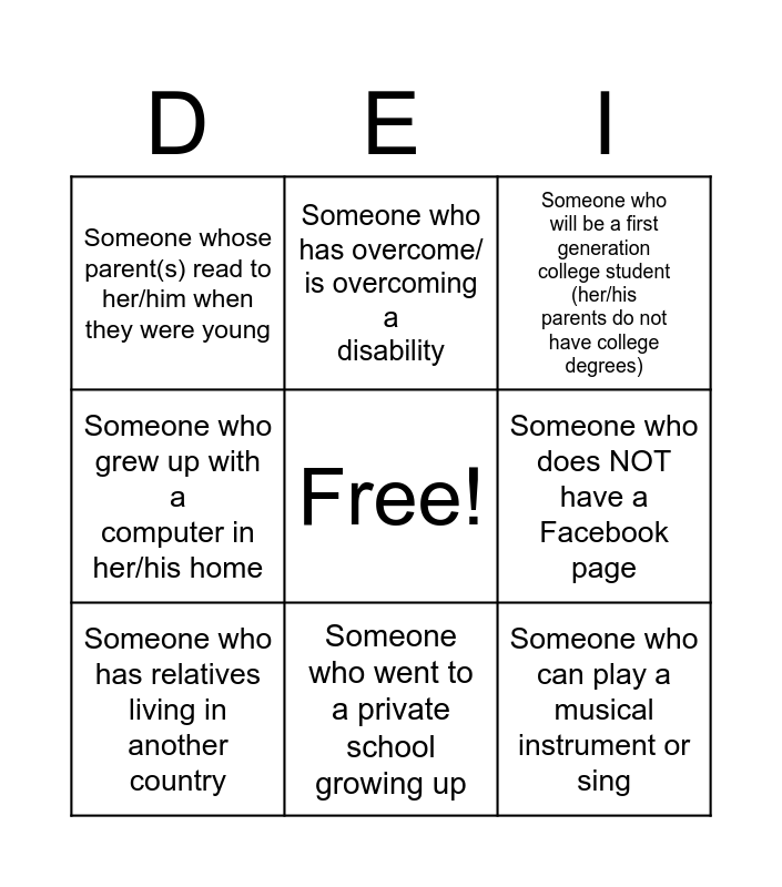 This bingo card has a free space and 8 words: Someone who does NOT have a Facebook page, Someone who will be a first generation college student (her/his parents do not have college degrees), Someone who has overcome/ is overcoming a disability, Someone who has relatives living in another country, Someone whose parent(s) read to her/him when they were young, Someone who can play a musical instrument or sing, Someone who grew up with a computer in her/his home and Someone who went to a private school growing up.