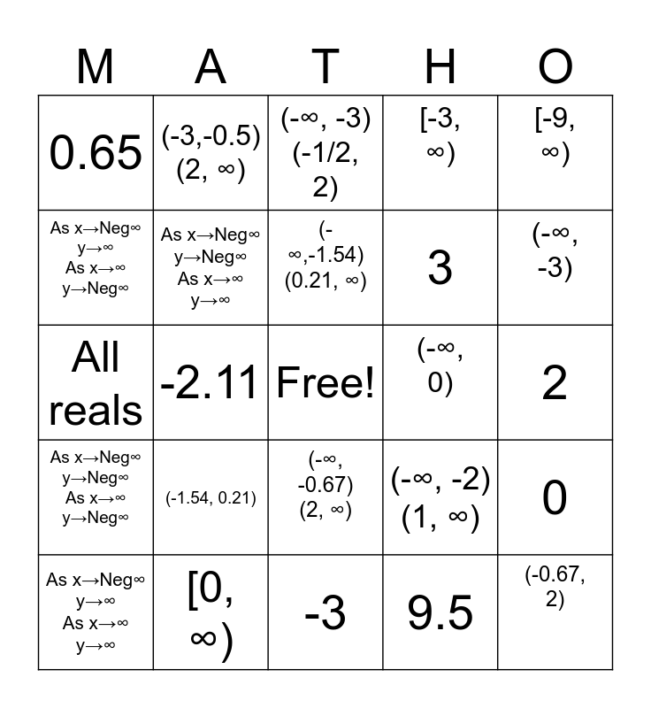 This bingo card has a free space and 27 words: (-∞, -2) (1, ∞), (-2, 1), 3, -3, As x→Neg∞ y→∞ As x→∞ y→Neg∞, (-∞, -3) (-1/2, 2), (-3,-0.5) (2, ∞), As x→Neg∞ y→Neg∞ As x→∞ y→Neg∞, (-∞, 0), 0, All reals, [-3, ∞), As x→Neg∞ y→∞ As x→∞ y→∞, [0, ∞), (-∞, -3), (-3, 2), As x→Neg∞ y→Neg∞ As x→∞ y→∞, (-∞,-1.54) (0.21, ∞), (-1.54, 0.21), 0.65, 2, 9.5, -2.11, (-0.67, 2), (-∞, -0.67) (2, ∞), [-9, ∞) and (-∞, 4].