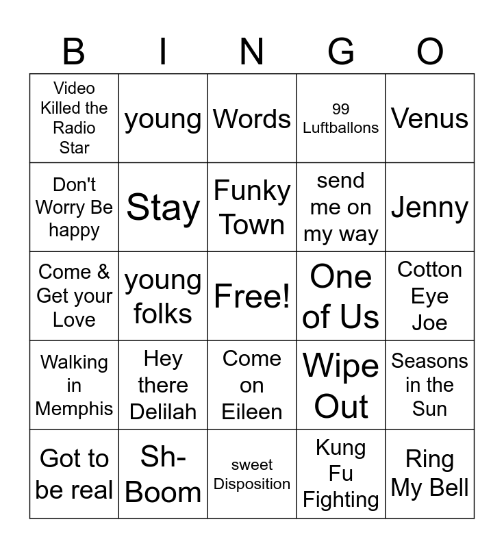 This bingo card has a free space and 35 words: My Sharona, Hooked on a Feeling, Whats UP, Stay, Come on Eileen, 99 Luftballons, Don't Worry Be happy, Spirit In the sky, Funky Town, Some body I use to know, Come & Get your Love, Venus, I'll Be Gone, 96 Tears, Video Killed the Radio Star, One of Us, Kung Fu Fighting, young folks, Walking in Memphis, Ring My Bell, Wipe Out, Got to be real, Seasons in the Sun, Sh-Boom, Words, Jenny, Stuck in the Middle with you, Black Velvet, send me on my way, Cotton Eye Joe, Heartbeats, sweet Disposition, Hey there Delilah, young and You are my girl.