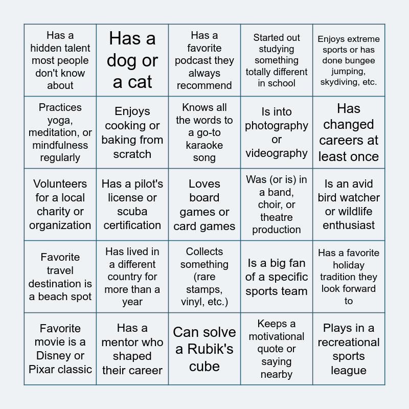 This bingo card has 35 words: Moved to Sobi from a completely different industry, Has run a marathon or completed a similar endurance event, Can speak more than one langauge, Enjoys cooking or baking from scratch, Collects something (rare stamps, vinyl, etc.), Started out studying something totally different in school, Practices yoga, meditation, or mindfulness regularly, Has read more than 10 books this year, Knows all the words to a go-to karaoke song, Loves DIY projects or home improvement, Volunteers for a local charity or organization, Enjoys extreme sports or has done bungee jumping, skydiving, etc., Learned something you never would have guessed about someone, Enjoys hiking, camping, or being in nature, Has a hidden talent most people don't know about, Was (or is) in a band, choir, or theatre production, Keeps a motivational quote or saying nearby, Has a pilot's license or scuba certification, Favorite travel destination is a beach spot, Loves board games or card games, Is a big fan of a specific sports team, Favorite movie is a Disney or Pixar classic, Has a favorite holiday tradition they look forward to, Has a mentor who shaped their career, Has a favorite podcast they always recommend, Has changed careers at least once, Plays in a recreational sports league, Plays a musical instrument, Is into photography or videography, Is an avid bird watcher or wildlife enthusiast, Knows how to knit, crochet, or do some other craft, Can solve a Rubik's cube, Has lived in a different country for more than a year, Has a dog or a cat and Can ski or snowboard.