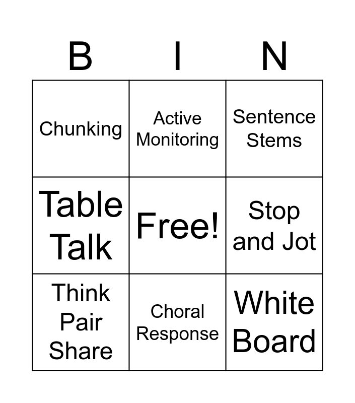 This bingo card has a free space and 8 words: Stop and Jot, Sentence Stems, Active Monitoring, Think Pair Share, Chunking, White Board, Table Talk and Choral Response.