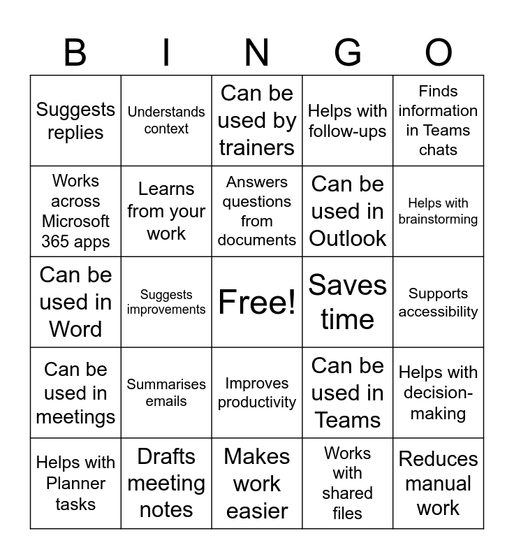 This bingo card has a free space and 24 words: Summarises emails, Drafts meeting notes, Answers questions from documents, Helps with Planner tasks, Finds information in Teams chats, Suggests replies, Works across Microsoft 365 apps, Understands context, Saves time, Improves productivity, Can be used in Outlook, Can be used in Word, Can be used in Teams, Helps with decision-making, Learns from your work, Works with shared files, Supports accessibility, Can be used by trainers, Helps with brainstorming, Suggests improvements, Reduces manual work, Can be used in meetings, Helps with follow-ups and Makes work easier.