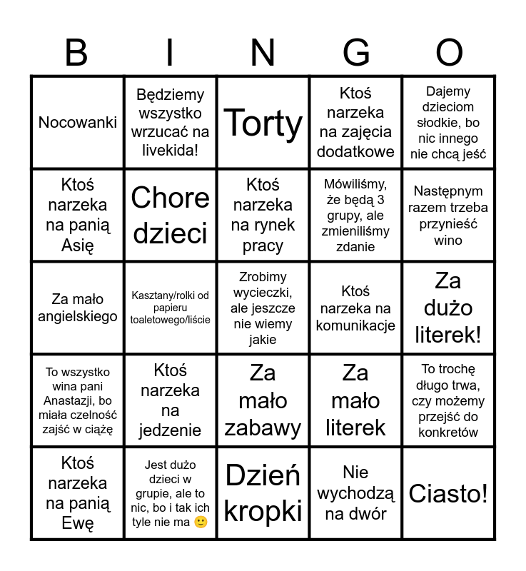 This bingo card has a free space and 24 words: Ktoś narzeka na jedzenie, Jest dużo dzieci w grupie, ale to nic, bo i tak ich tyle nie ma 🙂, Ktoś narzeka na rynek pracy, Ktoś narzeka na panią Ewę, Dajemy dzieciom słodkie, bo nic innego nie chcą jeść, Nocowanki, Ktoś narzeka na panią Asię, Będziemy wszystko wrzucać na livekida!, Ktoś narzeka na komunikacje, Za mało zabawy, Mówiliśmy, że będą 3 grupy, ale zmieniliśmy zdanie, Za mało angielskiego, Za mało literek, To trochę długo trwa, czy możemy przejść do konkretów, Chore dzieci, Nie wychodzą na dwór, Za dużo literek!, Torty, Następnym razem trzeba przynieść wino, Kasztany/rolki od papieru toaletowego/liście, Ciasto!, To wszystko wina pani Anastazji, bo miała czelność zajść w ciążę, Ktoś narzeka na zajęcia dodatkowe and Dzień kropki.