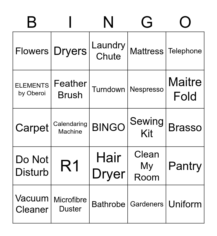 This bingo card has a free space and 29 words: Vacuum Cleaner, Mop, Calendaring Machine, Marble, Flowers, Laundry Chute, Feather Brush, R1, Sewing Kit, Microfibre Duster, Brasso, Uniform, Bathrobe, Gardeners, Maitre Fold, Dusting, Hair Dryer, Do Not Disturb, Telephone, Carpet, Clean My Room, Pillows, Nespresso, ELEMENTS by Oberoi, Mattress, Dryers, Pantry, Turndown and Minibar.